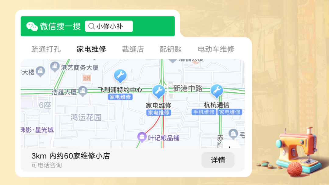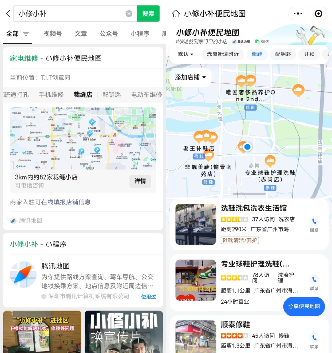 今年2月,商务部强调让修鞋、配钥匙等“小修小补”规范有序回归百姓生活,“小修小补”引路行动应运而生。由微信和腾讯地图联合发起,筛选出全国200多个城市超50万个修补小店的地理位置和服务信息,为全国便民修补小店打造了这份专属主题地图。用户在腾讯地图App、微信里搜索关键词“小修小补”,可轻松找到家门口的各类便民修补小店。