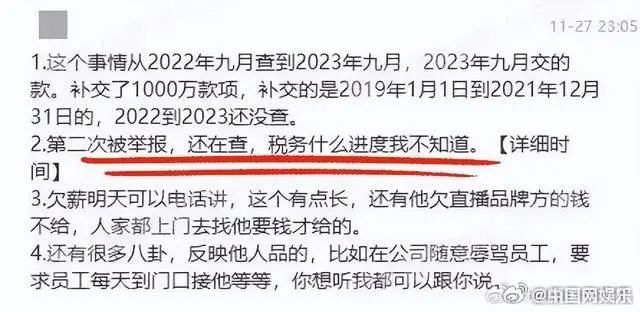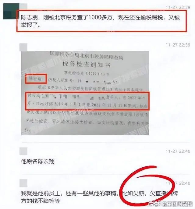 12月1日,据中国网娱乐报道,近日,有八卦博主曝料疑似陈志朋两次偷税漏税被查,员工爆料其2019-2021年偷税漏税,补缴税款高达1000多万元。 此外,该员工还透露,陈志朋未与员工签订劳动合同,违规解散公司,并拖欠员工赔偿金。在工作期间,陈志朋还被指经常辱骂员工,言辞粗俗。如果没和他打招呼,就会被骂“你是瞎了还是聋了” ,团队员工都在看心理医生。 同时,陈志朋与多个合作公司存在矛盾,收钱后直播态度不认真,甚至还欠品牌方的钱款未还。 天眼查App显示,涉事公司杭州树美花郡网络科技有限公司成立于2022年2月,法定代表人为李长友,注册资本500万人民币,经营范围包括文化娱乐经纪人服务、组织文化艺术交流活动、互联网直播技术服务、市场营销策划等,由李喜来、李长友共同持股。 变更记录显示,11月10日, 陈宏翔(陈志朋)刚刚退出该公司股东并卸任监事,该公司企业类型也由有限责任公司(港澳台投资、非独资)变更为有限责任公司(自然人投资或控股)。 凤凰网财经《公司研究院》联系到该线索的爆料人——涉事公司杭州树美花郡网络科技有限公司前商务总监 @准老板王成功 。据其介绍,之所以把事情拿到明面上说,一是希望陈先生(陈志朋)能给自己一个说法;二、因为陈志朋助理李喜来不给自己开离职证明,并在电话里态度蛮横,让直接去劳动仲裁,很令人气愤;三、也是想给之前合作的商家一个交代。此外,该商务总监还表示,“目前纠纷已立案,静待开庭,我必将誓死捍卫我的权益。” 微博截图 公开资料显示,陈志朋,1971年5月19日出生于中国台湾,1988年,作为小虎队成员“小帅虎”出道。 图源:视觉中国 截至发稿,陈志朋方还未作出回应。 文章来源于极目新闻,如有侵权请联系删除。本文仅代表作者观点,不代表大湾网的观点立场。 |