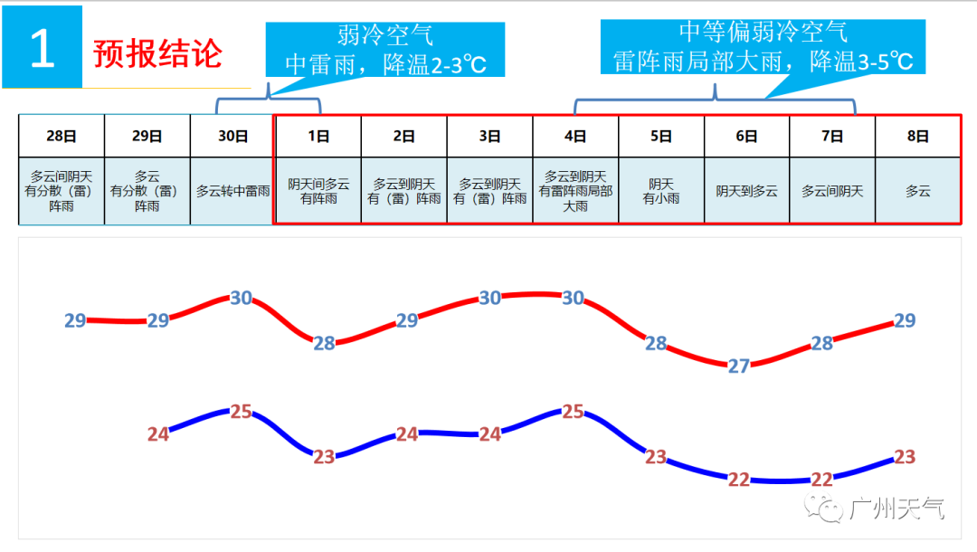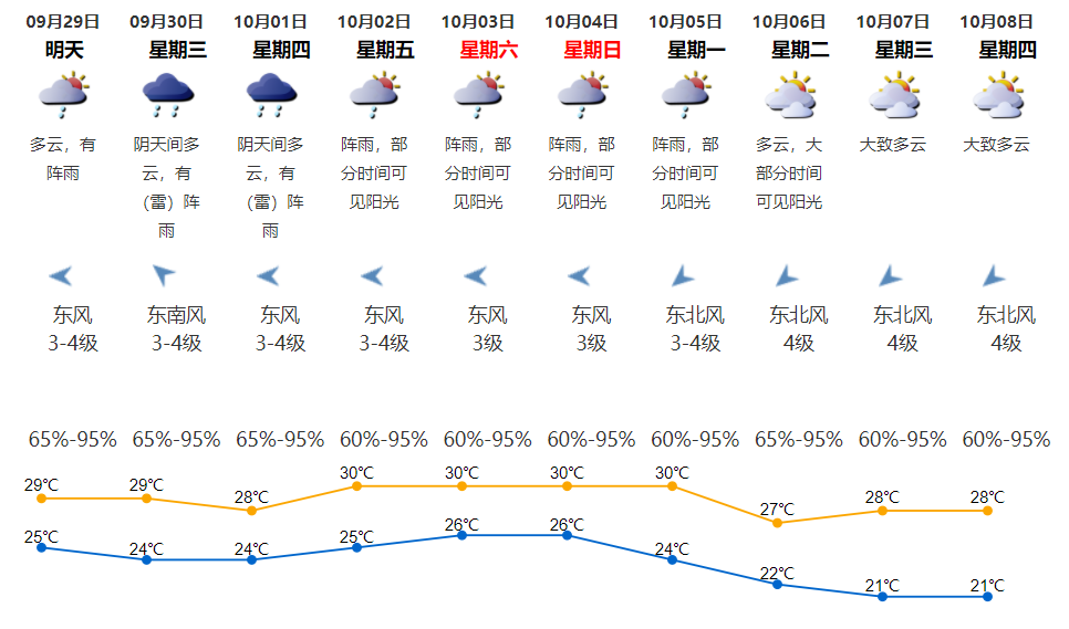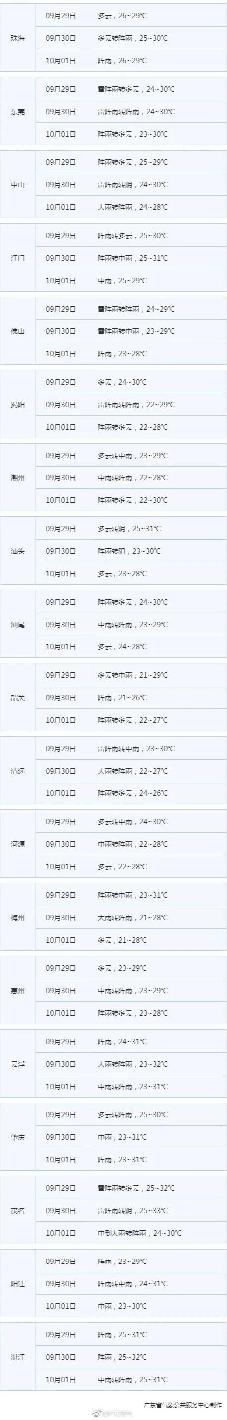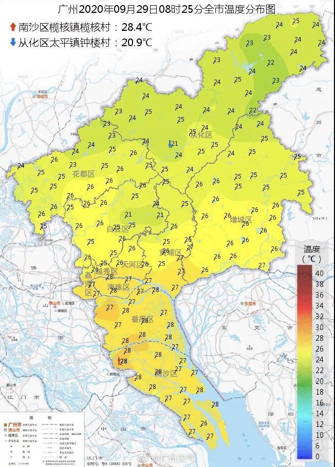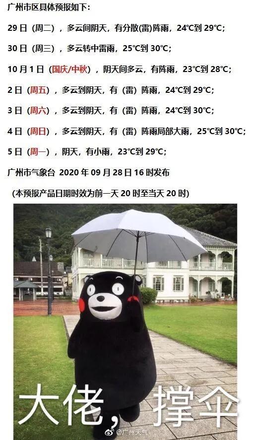 兄弟姐妹们! 就只有两天了! 大家都心心念念想出去玩了吧 无论是打算外出游玩还是宅家的小伙伴 一定都关心假期的天气怎么样吧 看看今天早上的气温图 绿油油地简直不要太舒服 虽然离真正入秋还有距离 但是,作为一个 每年都要入秋失败N次的城市 凉快就完事了 今天南都君带来一个好消息 国庆期间将有两股冷空气来广东 这个假期可能会比往年凉快~ 快来看详情 国庆期间有两股冷空气要来 初期多雷雨,后期降温伴大风 据@广东天气,国庆期间有两股冷空气:9月29日夜间~10月1日、10月4~7日。第一股冷空气降温不太明显,主要是降水;第二股冷空气降温较明显,降水较弱。 简单来说 天气总体比较舒适,较往年凉爽! 具体怎么样呢? ▼ 据@广州天气—— ☞ 冷空气一号(弱): 第一波30日的时候来,受其影响,30日到10月1日广州有中雷雨,伴有短时大风、降温2-3℃。 ☞ 冷空气二号(中等偏弱): 第二波的冷空气4号开始影响,终于来了个能打的,它是今年9月以来最强的冷空气了,受其影响,广州有雷阵雨局部大雨,同时气温下降3-5℃。 据@深圳天气—— ☞ 第一股冷空气: 第一股冷空气伴随降水,影响时间较短,降温不明显。受弱冷空气和切变线影响,30日至10月1日有雷雨,局部暴雨,雷雨时伴7级左右短时大风,气温下降2℃左右。 图据广东天气 ☞ 2-5日阳光阵雨相伴。 ☞ 第二股冷空气: 第二股冷空气在5日抵达,这次冷空气终于不是复姓“弱弱”了,它是今年9月以来最强的冷空气。 图据广东天气 伴随着切变线,6-7日多云,降雨不明显,早晨最低气温降至20-22℃,早晚清凉,沿海、高地和海区偏北阵风7-8级;8日可见阳光,风力减弱,气温回升。 不少人关心 中秋当天 广州可以看到月亮吗? 据广州天气,中秋当天,广州的云量会比较多。月神可能会躲在云中自己玩,不过在云缝里大家偶尔还是可以看到她的真容。 在广州的话,以下这些视野开阔、或者地势较高的地方,都是很好的赏月地点哦~ 大家可以参考下~ 今年的嫦娥 还有些特别! 今年嫦娥瘦了