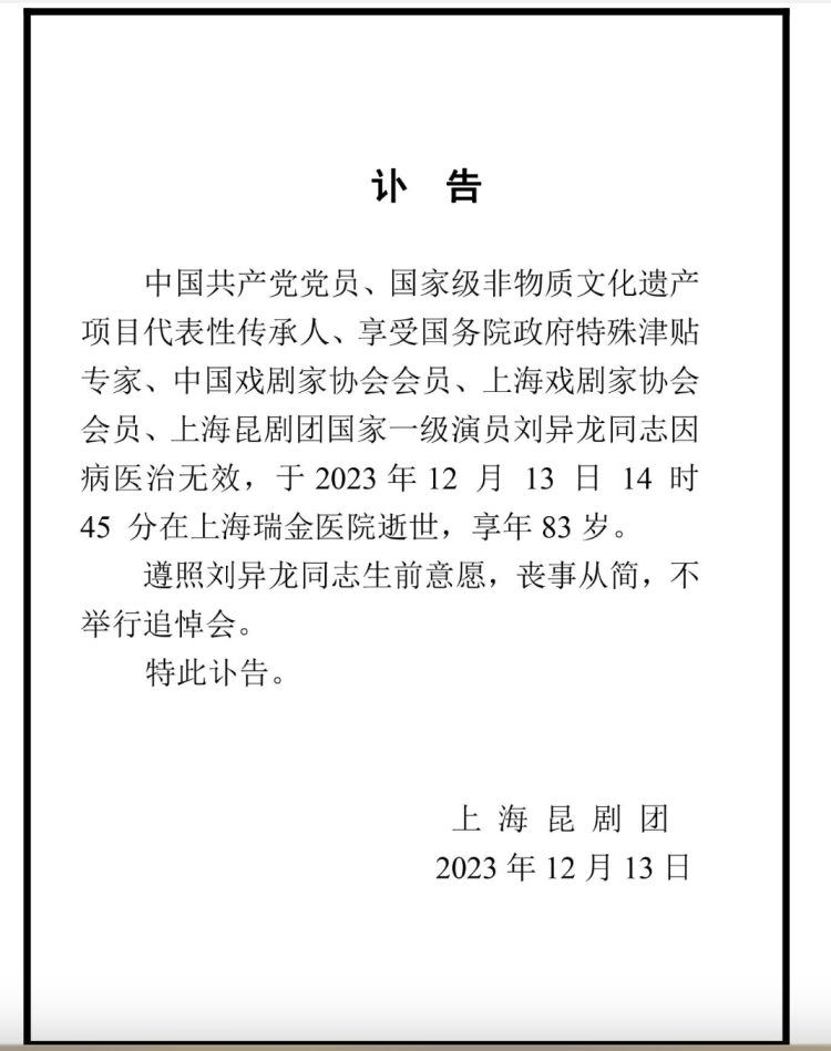 记者从上海昆剧团获悉,上海昆剧团国家一级演员刘异龙因病医治无效,于2023年12月13日14时在上海瑞金医院逝世,享年83岁。