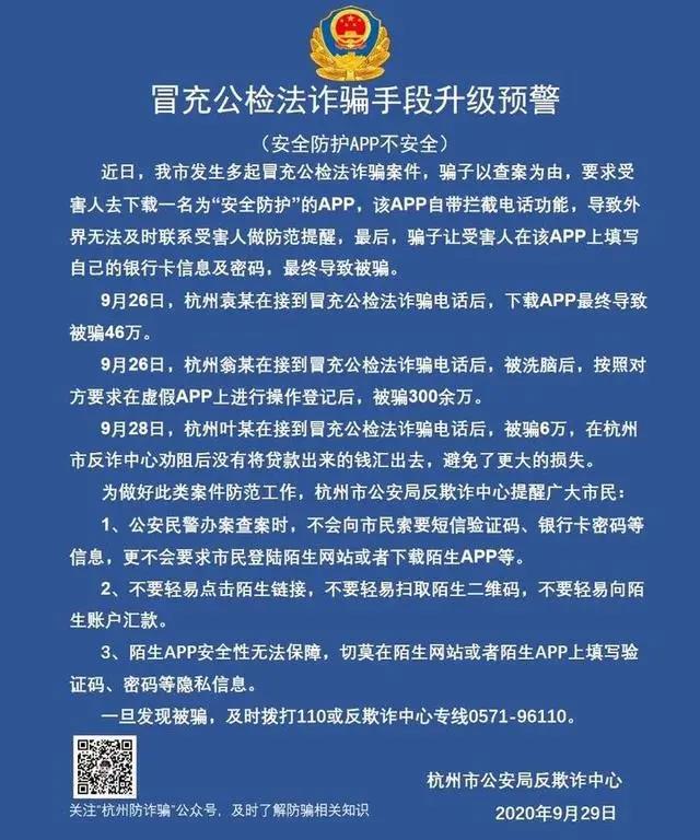 近日,杭州市公安局反欺诈中心发布预警,安全防护APP不安全。 来自杭州市公安局反欺诈中心消息,杭州最近发生多起冒充公检法诈骗案件。骗子手段升级,要求受害者下载一款名为“安全防护”的APP,这款APP自带拦截电话功能,导致外界无法及时联系受害人做防范提醒,最后,骗子会让受害人在APP上填写银行卡等信息,最终导致被骗。 9月26日,杭州李女士(化名)接到了一通电话,对方说是公检法部门的工作人员,在电话里准确说出了李女士的相关信息,并要求她下载一款“安全防护”的APP。就这样一个操作,李女士一步步落了骗子的陷阱,辛辛苦苦存下的300万被骗。 这款APP和以往诈骗类软件稍有区别,有技术拦截措施。也就是说,一旦下载这款APP,事主手机只能拨出,无法呼入,这时的事主已经接收不到外界的提醒信息。 其实那天李女士下载完APP之后,反诈中心已经发现了异常,只是这时候的李女士已经处于“失联”状态,接收不了民警发出的预警提醒。 遗憾的是,民警上门劝阻时,李女士夫妇也不在家,唯一在家的家人也联系不上他们…… 等到意识到被骗的时候,李女士选择了报警。 据了解,对方自称是工信局工作人员,核对完个人信息后告诉李女士涉嫌一起卖口罩诈骗案件,有逮捕令、保密局的调查令,一看这架势,李女士信以为真。所以当一个“湖南民警”让她远程报案的时候,李女士开始跟着对方的要求操作了。 之后的套路是骗子让她新买一个手机,办一个新的号码,然后发来一个链接,要求她下载“安全防护”APP完成资金验证…… 办案民警提醒,公检法人员是不会通过远程程序报案、传递逮捕令的。凡是碰见要求提供银行卡信息的,基本上是骗子,一定要提高警惕。 来源:每日经济新闻 |
