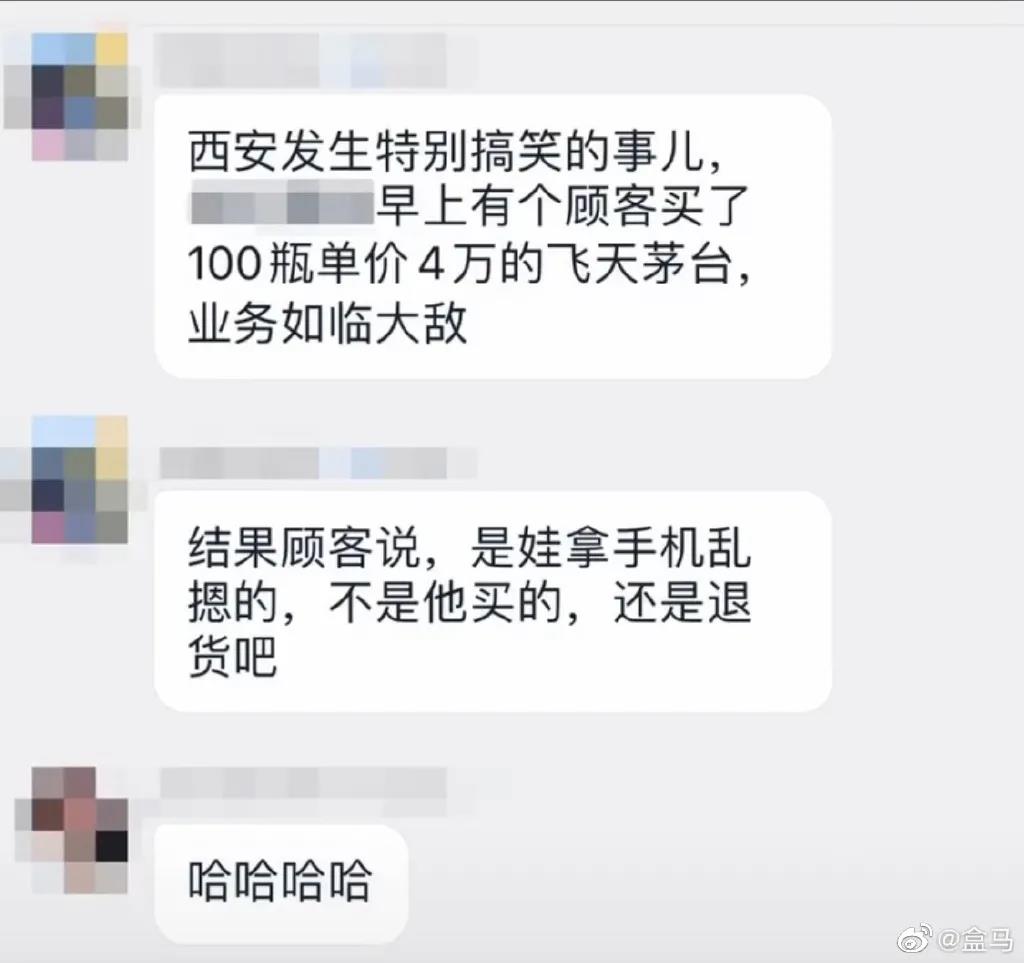因为高价格 不少人买茅台时 都下不了手。 没想到, 陕西西安那边有一个熊孩子厉害了 他一口气买了100瓶贵州茅台 而且每瓶是42999元 支付总额近430万元 他哪来那么多钱? 当然是他爸爸手机里的钱。 熊孩子玩家长手机 还偷偷给游戏充值的新闻 我们经常报道 少则几百,多则上万 这次的熊孩子 竟一下消费了近430万, 挑的还是茅台, 他是怎么做到的? 9月29日,西安盒马文景店接到两个大金额订单,两个订单加起来一共订购了100瓶茅台酒(42999元/瓶),支付总款项近430万元。 由于该商品为预售品, 门店当时并没有这么多库存 工作人员紧急联系采购了100瓶茅台酒。 在准备给顾客送货时 突然接到顾客的电话 进行配送的“小马哥”才知道, 这笔订单竟是顾客家里的熊孩子 玩家长手机时的误操作! 目前这笔订单已经退款。 西安盒马鲜生店工作人员表示,以后遇到高单价的商品他们会进行限购,避免顾客的误操作。 这孩子,估计把下单当成打游戏了 不少网友虽然觉得孩子坑爹 但也羡慕有这样的爹 |