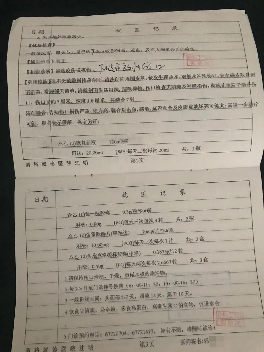 陈女士的就医记录显示:患者下肢开放性伤口长约7厘米,深度1厘米,共缝合7针,大腿多处有牙印咬伤。患者伤口损伤严重、张力高,缝合后出血、感染、延迟愈合及皮瓣皮肤坏死可能大,有需进一步治疗可能。