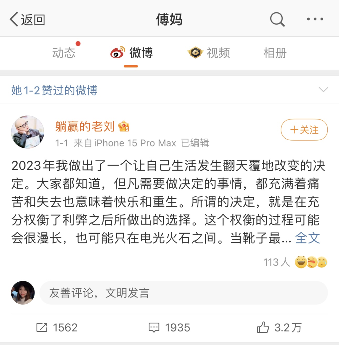 《奇葩说》辩手傅首尔老公刘毅 发长文回应两人关系, 称两人作为夫妻的缘分已终结。 长文中称傅首尔为了保护他,把两人分开的责任揽到自己身上,让自己成为集火的目标。“作为她的亲人、朋友,我没有办法眼睁睁看着孩子的母亲遭受如此羞辱。”他否认自己有抑郁症、被傅首尔处处打压、傅首尔完全不顾家等谣言,现在才出来回应是因为之前害怕把自己也卷进舆论的漩涡之中。“虽然爱人的缘分尽了,我们依然是亲人和最好的朋友,依然是多乐的爸爸妈妈,依然是彼此最可仰仗的后盾。” 2023年我做出了一个让自己生活发生翻天覆地改变的决定。大家都知道,但凡需要做决定的事情,都充满着痛苦和失去也意味着快乐和重生。所谓的决定,就是在充分权衡了利弊之后所做出的选择。这个权衡的过程可能会很漫长,也可能只在电光火石之间。当靴子最终落地的时候,一股松弛感油然而生。 上下滑动查看全文 刘毅发布长文后 傅首尔点赞该微博 网友纷纷留言 据悉, 傅首尔与刘毅婚后育有一子, 2020年获得《奇葩说第七季》总决赛冠军, 2023年两人参加《再见爱人》录制。 文章来源于钱江晚报,如有侵权请联系删除。本文仅代表作者观点,不代表大湾网的观点立场。 |
