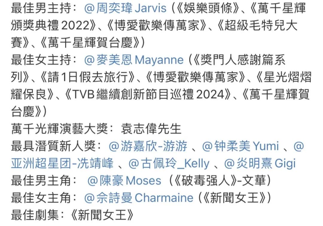 昨晚,TVB“万千星辉颁奖典礼2023”举行。佘诗曼凭借《新闻女王》的文慧心一角获2023TVB颁奖礼