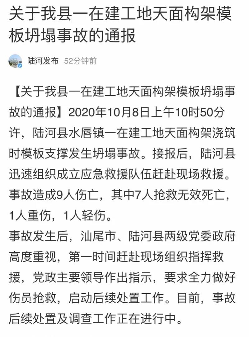今天(10月8日),广东汕尾陆河县人民政府官方微博发布关于该县一在建工地天面构架模板坍塌事故的通报。 据通报,2020年10月8日上午10时50分许,陆河县水唇镇一在建工地天面构架浇筑时模板支撑发生坍塌事故。接报后,陆河县迅速组织成立应急救援队伍赶赴现场救援。事故造成9人伤亡,其中7人抢救无效死亡,1人重伤,1人轻伤。 事故发生后,汕尾市、陆河县两级党委政府高度重视,第一时间赶赴现场组织指挥救援,党政主要领导作出指示,要求全力做好伤员抢救,启动后续处置工作。目前,事故后续处置及调查工作正在进行中。 来源:南方都市报 |