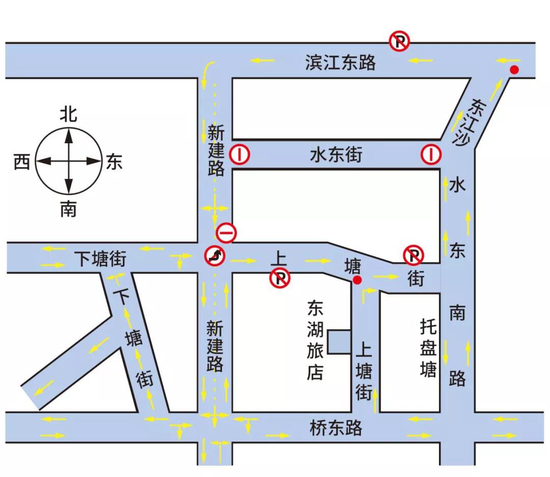 施工期间,水东街实行全封闭施工、禁止机动车通行;滨江东路由桥东市场路口起东往西、新建路由北往南至下塘街路口段实施单行交通组织;下塘街禁止左转进入新建路;取消滨江东路、下塘街路边停车位。