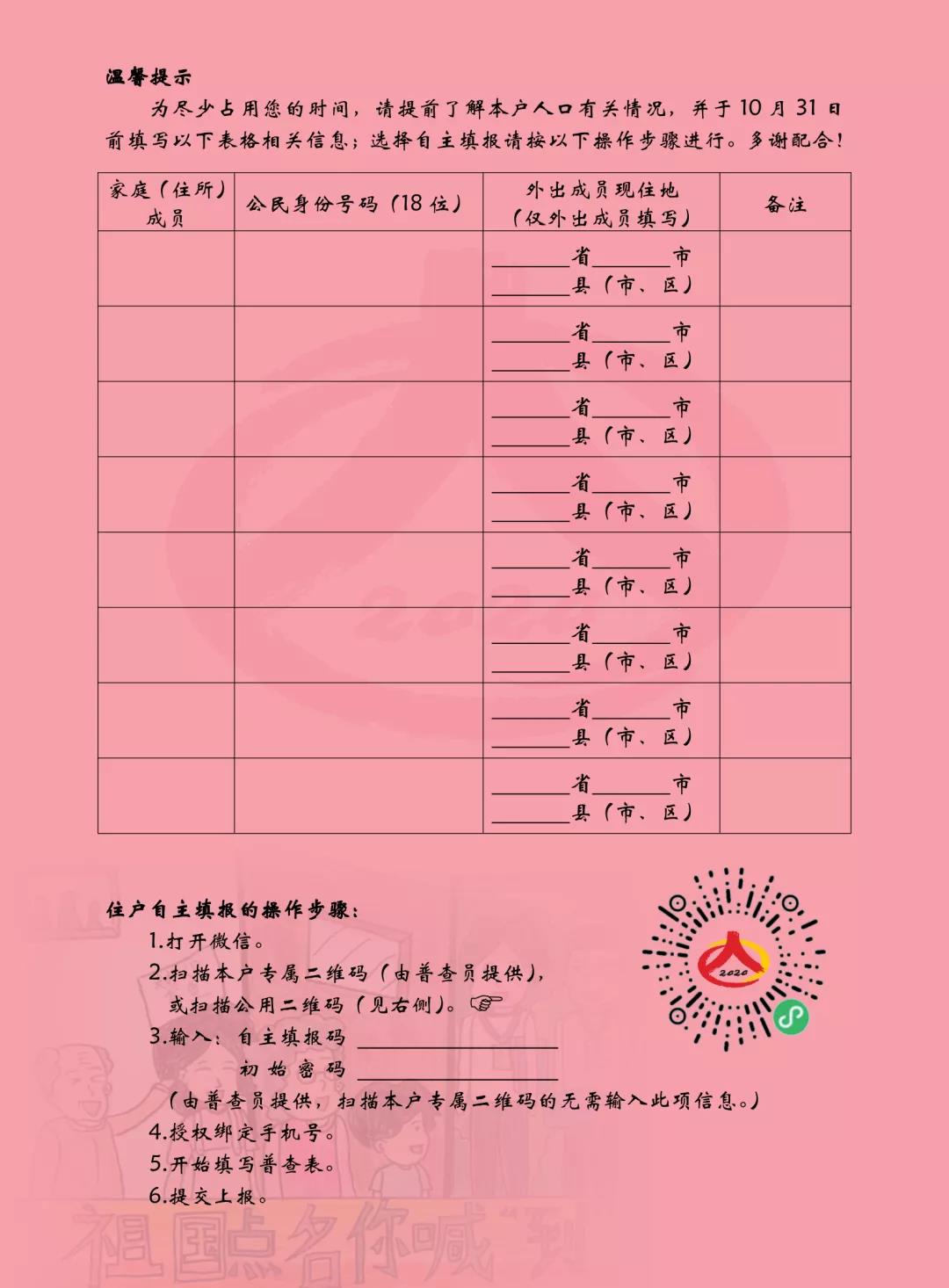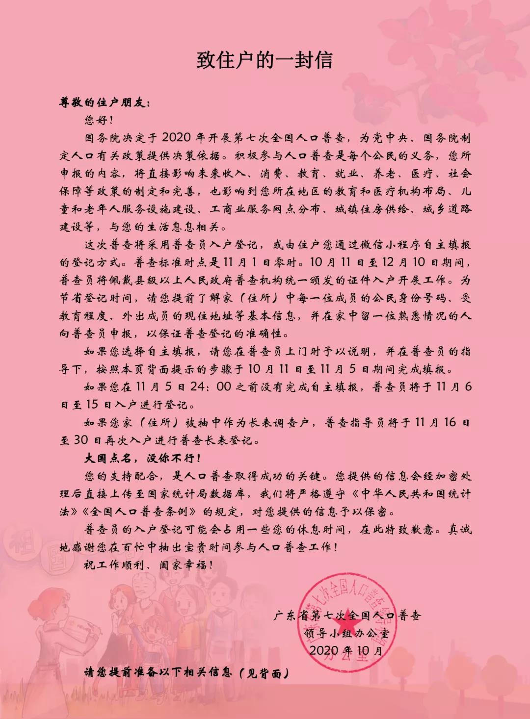 注意! 注意! 注意! 第七次全国人口普查开始入户调查啦! 即日起至12月10日期间, 普查员将入户登记,家中需要留人! ↓↓↓ 致住户的一封信 尊敬的住户朋友: 您好! 国务院决定于2020年开展第七次全国人口普查,为党中央、国务院制定人口有关政策提供决策依据。积极参与人口普查是每个公民的义务,您所申报的内容,将直接影响未来收入、消费、教育、就业、养老、医疗、社会保障等政策的制定和完善,也影响到您所在地区的教育和医疗机构布局、儿童和老年人服务设施建设、工商业服务网点分布、城镇住房供给、城乡道路建设等,与您的生活息息相关。 这次普查将采用普查员入户登记,或由住户您通过微信小程序自主填报的登记方式。普查标准时点是11月1日零时。10月11日至12月10日期间,普查员将佩戴县级以上人民政府普查机构统一颁发的证件入户开展工作。为节省登记时间,请您提前了解家(住所)中每一位成员的公民身份号码、受教育程度、外出成员的现住地址等基本信息,并在家中留一位熟悉情况的人向普查员申报,以保证普查登记的准确性。 如果您选择自主填报,请您在普查员上门时予以说明,并在普查员的指导下,按照本页背面提示的步骤于10月11日至11月5日期间完成填报。 如果您在11月5日24:00之前没有完成自主填报,普查员将于11月6日至15日入户进行登记。 如果您家(住所)被抽中作为长表调查户,普查指导员将于11月16日至30日再次入户进行普查长表登记。 大国点名,没你不行! 您的支持配合,是人口普查取得成功的关键。您提供的信息会经加密处理后直接上传至国家统计局数据库,我们将严格遵守《中华人民共和国统计法》《全国人口普查条例》的规定,对您提供的信息予以保密。 普查员的入户登记可能会占用一些您的休息时间,在此特致歉意。真诚地感谢您在百忙之中抽出宝贵时间参与人口普查工作! 祝工作顺利、阖家幸福! 广东省第七次全国人口普查 领导小组办公室 2020年10月 除了以往的普查员入户登记,第七次全国人口普查还增加了通过微信小程序自主填报的方式。 届时,市民可以在普查员的指导下,打开微信,扫描二维码进行填报。 大国点名,没你不行 齐支持,齐参与! 来源:顺德区第七次全国人口普查领导小组办公室、珠江商报 |