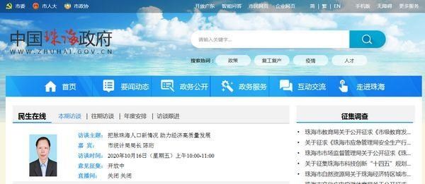 珠海市统计局党组书记、局长陈珩将于10月16日上午10:00至11:00通过珠海市政府网站“民生在线”栏目与网友在线交流,重点解答网友关心的统计工作相关问题,广泛听取意见和建议。 本次在线互动交流主要围绕“把脉珠海人口新情况,助力珠海经济高质量发展”这一主题,就珠海市统计工作重点、热点问题进行交流和回应。即日起,欢迎广大网民朋友们登陆珠海市委网、珠海市政府网站的“市统计局在线交流”专栏留言(网址http://zxft1.zhsw.gov.cn/197ldzbj/index2.html)。在线交流当天,上述网站也将进行全程图文直播。届时,欢迎网民朋友们踊跃提问发言,为不断加强和改进统计工作,着力依法科学统计,切实提升统计服务经济社会发展水平建言献策。 来源:珠海市统计局 |