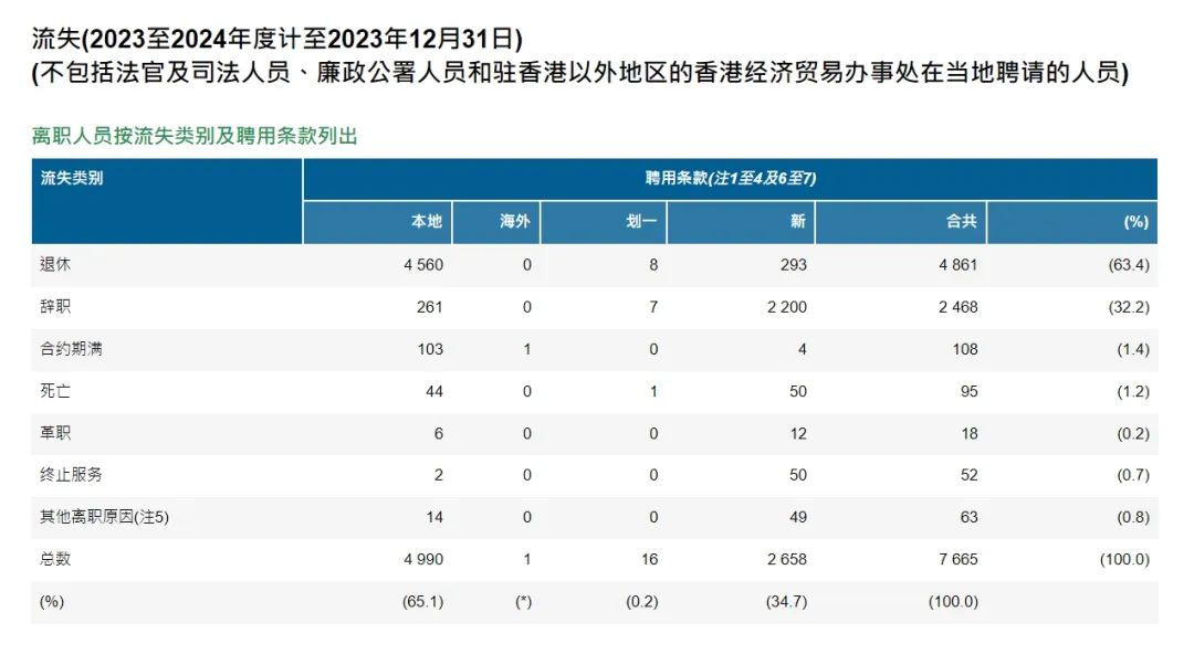 根据2023至2024年度香港港公务员流失数据来看,超过六成的人是由于退休而离职的。