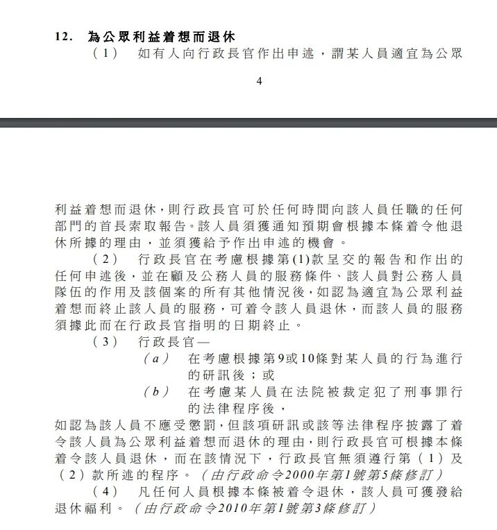 就在今年3月,香港公务员事务局局长杨何蓓茵女士茵表示,简化机制半年间向6名公务员发出退休通知书,其中1人将被勒令退休。