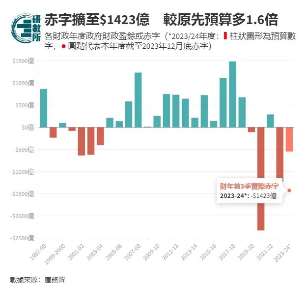 根据库务署最新数据,截至2023年底(即2023/24年度首9个月),政府综合赤字暂时扩大至1,423亿元,暂较原先预算的543.7亿元高出了近2倍!
