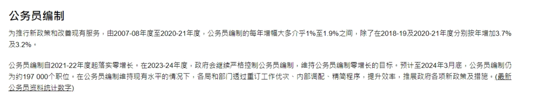 而有关于未来公务员数量,香港政府则表示在2024至25年度,会继续维持整体公务员编制零增长的目标,并且控制在不高于2021年3月底的水平。
