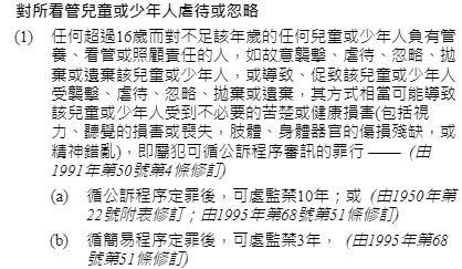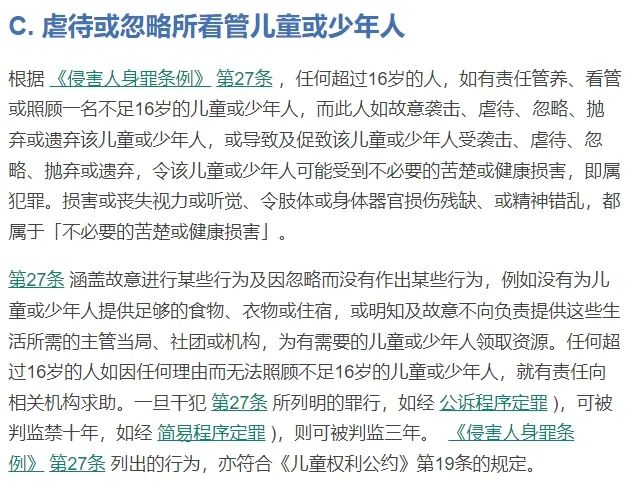 因为根据《侵害人身罪条例》,任何人忽略由他们所管养、看管或照顾的16岁或以下的儿童或少年人,而导致其受到不必要的苦楚或健康损害,均属刑事罪行。