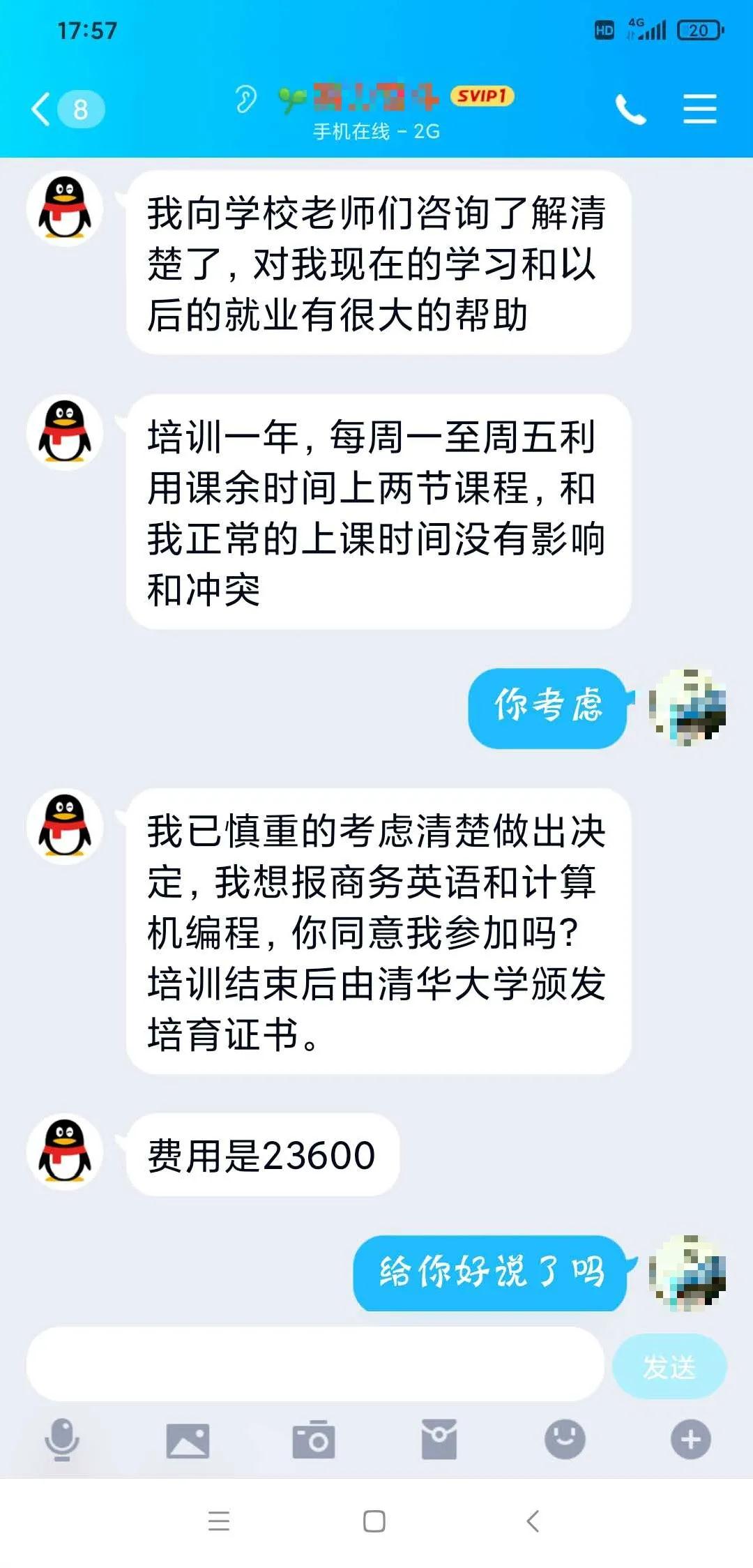 孩子好学 作为家长当然要鼎力支持 一掷千金也在所不辞 若突然有一日 在QQ或者短信问你要培训费? NO!先停下给钱的手! 这很可能是诈骗陷阱!