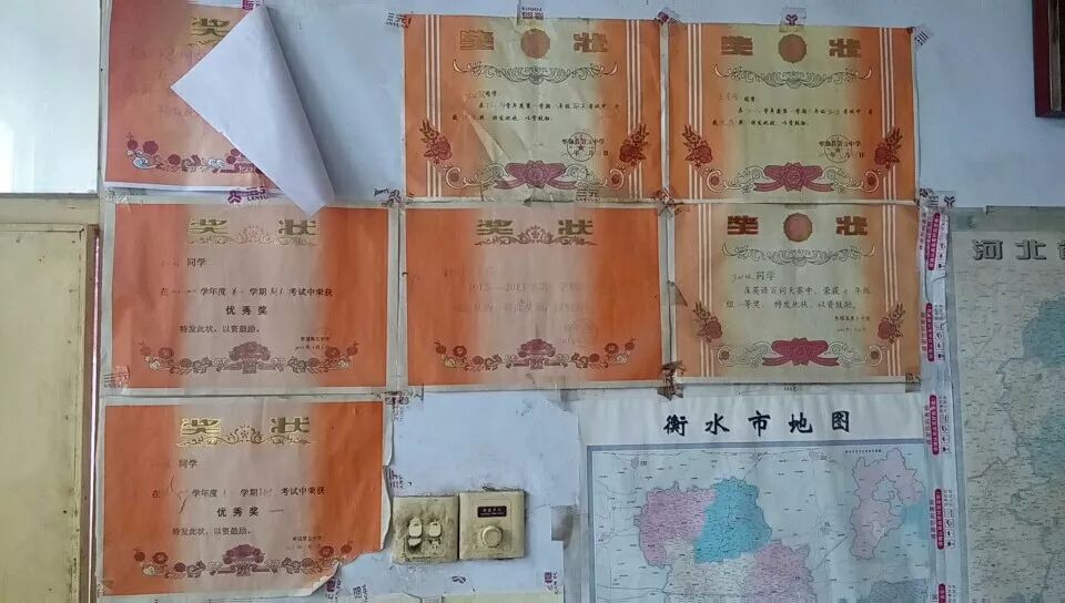 房间里唯一豪华的装修,就是墙壁上贴的那一张张奖状。
