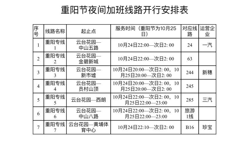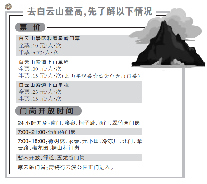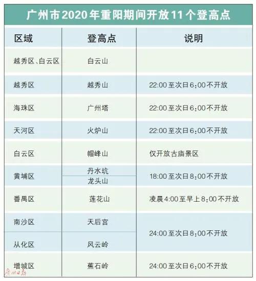 今年10月25日(农历九月初九,星期日)是我国传统的重阳节。根据民俗习惯,预计今天晚上(10月24日,星期六)会有大量市民自发前往全市各登高点登高祈福。 为保障群众登高活动安全,广州市成立2020年重阳节群众登高活动安全工作指挥部,对疫情防控、登高安全、交通组织、服务保障、文化活动等方面做出周密安排。 今年广州全市安排白云山、越秀公园、广州塔、火炉山等11个开放登高点,按照常态化疫情防控要求,各登高点接待游客量按照不超过最大承载量的70%控制。市民在登高期间,请佩戴口罩,做好个人防护,并遵守消防、治安、交通等管理规定,听从现场工作人员指引。全市各地组织了丰富多彩的文化娱乐活动,市民可自行就近参加。 资料图 重阳节登山攻略来了! 市有关部门对全市适宜登高的地点进行筛选,安排白云山、越秀公园、广州塔、火炉山等11个开放登高点,为有意登高的市民提供选择。重阳节期间(10月24日凌晨6:00至10月26日凌晨4:00),除列出的11个登高点开放外,其他登高地区实施封山,谢绝游客上山,以免发生意外事故。11个开放登高点中,有部分登高点24日夜间不开放(详见下表登高点的说明),市民可根据实际情况选择白天或人流不多的时间段错峰登高。 市民登高请遵守以下防控要求: 一、所有登高人员及工作人员(含媒体记者,下同)请提前在“穗康码”等健康二维码上进行自我健康申报,观察身体是否出现发热、寒战、咳嗽、咽痛、打喷嚏、流涕、鼻塞、头痛、乏力、肌肉酸痛等症状,出现症状请及时就诊,排除新冠肺炎等重点传染病后,才能参加登高和相关工作。 二、所有登高人员及工作人员进入登高点时,请持“穗康码”“粤康码”等健康通行码蓝(绿)码,供相关工作人员查验。请按规定佩戴口罩,在售票窗口、检票处、乘车点等设置“一米线”的区域,请按线排队,在景区游览时请不要扎堆、聚集。 三、以下人员不要参加登高:1.目前为新冠肺炎确诊病例、疑似病例、无症状感染者及密切接触者;2.已治愈出院的确诊病例和已解除集中隔离医学观察的无症状感染者,尚在随访及医学观察期内的;3.人员入境后处于集中隔离医学观察期的。 资料图 重阳节期间(10月24日凌晨6:00至10月26日凌晨4:00),白云山进山门票和摩星岭门票推行线上(“白云山风景名胜区”微信公众号)预约、售票,白云索道推行线上预约,线下售票。按接待量不超过日最大承载量的 70%,控制景区和室内场馆的客流量。 白云山景区和摩星岭门票全票10元/人・次,半票5元/人・次。白云山索道上山单程全票30元/人・次,半票15元/人・次(上山单程票价已含白云山门票);白云山索道下山单程全票25元/人・次,半票13元/人・次。重阳节期间,暂停集体登白云山活动,白云山各门岗暂时停止售卖月卡、年卡、半年卡,之前购买的各类月卡、年卡、半年卡可以使用。 重阳期间白云山门岗开放时间如下: (1)南门、濂泉、柯子岭、西门、翠竹园门岗24小时开放; (2)伍仙桥门岗开放时间为7:00-21:00; (3)荷树林、永泰、元下田、冷冻厂、北门、摩云路、梅花园、握山村门岗开放时间为7:00-18:00; (4)绿道、五龙谷门岗暂不开放; (5)摩云路门岗需绕行云溪公园正门进入。 为确保安全有序,重阳节期间,除摩星岭、山顶广场外,其他山峰以及无登山路径的山坡暂停开放。 相关部门提醒,登山游客应注意查看新增设立的人流分流引导告示牌,按照指定线路登山游览。白云山个别偏僻小路和照明不足的登山小路暂停开放,对没有灯光的非正规小路进行封堵。 摩星岭顶只保留单向通行功能,山上道路按照以下路线通行: 主峰摩星岭实行单向行走,山南上,山北下; 云天南路、云天北路实行由南向北单向行走(从云天南路上山不登摩星岭的游客从云天北路下山,从云山北路上山和从云山中路下山的游客禁止从云天北路通行)。 千尺嶝每日23时前只能上山,24时后只能下山。 资料图 预计10月24日晚将有较多市民前往白云山等区域登高,市交通运输部门将在人流较密集区域加强运力安排,优化交通组织,保障市民公共交通出行。 一是强化重点区域公共交通服务保障。在10月24日、25日当晚,通过加密班次、空车切入、短线调度等措施,强化途经白云山、广州塔等登高区域的公交、出租车运力供给。 同时,在10月24日、25日每晚的20:00至次日凌晨2:00,将开行云台花园总站至员村山顶、中山五路、中山八路、黄埔体育中心等主要出行方向的7条夜班专线,为市民夜间出行提供选择。 在云台花园、白云山西门等区域,设置3个出租车临时上落客点。 二是强化公共交通运营秩序管理。10月24日17:00起至25日6:00,临时撤销公共汽车白云索道站(双向)、云台花园站(北行);从18:00起至25日6:00,途经公共汽车云台花园总站的公交线路在进入总站前将实施前置下客,并空车进入总站。市民请提前在公共汽车金贵村站(西行)、白云索道站(东行)①号分站以及横枝岗临时下客点提前下车。 交管部门提醒,由于白云山等周边公共停车场地有限,请前往登高点的市民尽量搭乘公共交通工具。市民如需详细了解重阳节期间公共交通情况,可通过拨打“96900”客服热线、登录广州交通网(www.gzjt.gov.cn)。 为确保广大市民前往白云山、广州塔、帽峰山和花城广场活动的交通安全有序,广州市公安机关交通管理部门将采取以下临时交通管制措施: ●白云山周边的临时交通