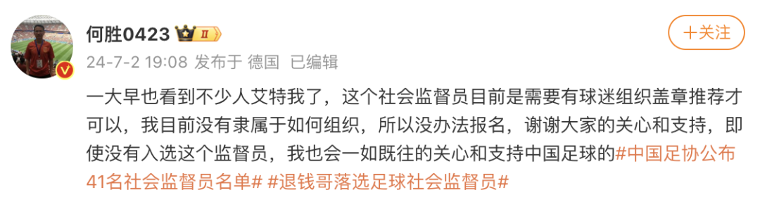 中国足协公布聘任足球社会监督员名单(图片来源:中国足协官网)全部人员名单如下:社会人士代表21人:万礼、王罡、白涛、成焘、李翔、何柏俊、邹朗平、张引、陆洁冰、陈元欣、罗俊、岳博、周大卫、周晋民、郑林、赵伟、胡燕、高爽、高澄清、黄志坚、蒋军辉。球迷组织代表10人:王文、王津洲、邓照亮、刘春涛、李强、吴楚君、陈涛、胡庆、贺伟、程小平。新闻媒体代表10人:公兵、刘硕阳、刘会滨、许辉辉、张安琪、陈海翔、林蒙、赵宇、郭文青、葛会忠。7月2日,何胜发文回应落选:这个社会监督员目前是需要有球迷组织盖章推荐才可以,我目前没有隶属于如何组织,所以没办法报名,谢谢大家的关心和支持,即使没有入选这个监督员,我也会一如既往的关心和支持中国足球的。据此前报道,3月28日,中国足协发布《关于聘请足球社会监督员的通告》(以下简称《通告》),拟面向全国公开聘请足球社会监督员。《通告》称,为进一步加强对足球行业的监督管理,提高足球工作的透明度,促进足球事业的健康发展,中国足协面向全国新闻媒体、球迷组织聘请监督员若干名;面向足球职业联赛赛区所在城市邀请纪检监察部门代表、人大代表和政协委员若干名作为监督员参与监督工作。《通告》发布后,“退钱哥”何胜发文:“吃个饭的工夫,看到一群人@我,我以为我又说错啥话了呢,早上看到这条新闻了,当时也没在意,后面看到很多人在评论区给我留言的,我慎重考虑了一下,决定报名试试,如果有幸选上,为中国足球做一点力所能及的事情,一定尽心尽力,不随波逐流。” 资料显示,网红“退钱哥”,本名何胜,原籍新疆,大学毕业后留在四川工作,是一名结构工程师。作为一位资深的国足球迷,何胜一直以来都是国足的坚定支持者。 “退钱哥”何胜(@何胜0423)2016年10月6日在西安举行的2018年俄罗斯世界杯亚洲区预选赛12强赛,国足0∶1败给叙利亚队。赛后一名女记者将话筒递给一位身穿中国队红色球衣、围着球迷围巾的先生。当时,正值该先生情绪最激动的时候,他对着话筒怒吼:“对得起我们吗?XXX,退钱!”视频经网络传播后,短短几个小时就获得5000多万次播放量。网友也将其称之为“退钱哥”。目前,何胜在各社交平台的粉丝数量已经超过百万,他本人也经常分享自己观赛的视频。文章来源于红星新闻、极目新闻、中国足协官网、奔流新闻,如有侵权请联系删除