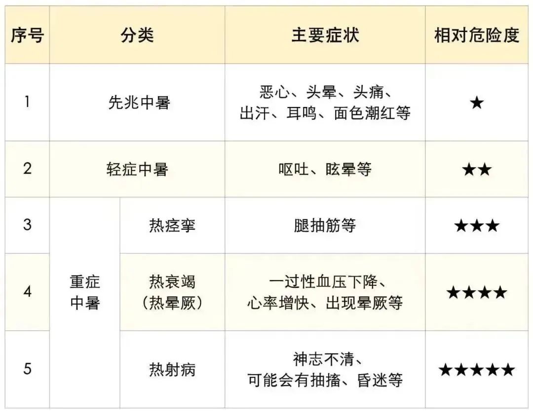 从临床表现来看,中暑由轻到重可分为3大类:先兆中暑、轻症中暑、重症中暑。