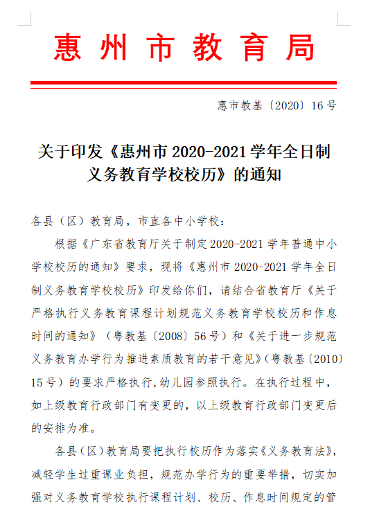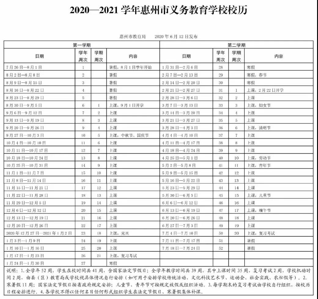 自打国庆假期后 经历了2020年史上最长寒假 2021年寒假又准备如何安排? 目前多省市学校放假时间已经确定 快来看看 今年的寒假如何安排? 广东小学初中寒假时间:2021年1月25日到2021年2月21日。 重庆寒假时间:2021年1月30日到2021年2月28日。 北京寒假时间:2021年1月30日到2021年2月28日。 上海寒假时间:2021年1月23日到2021年2月21日。 天津寒假时间:2021年1月25日到2021年2月21日。 吉林寒假时间:2021年1月5日到2021年2月24日。 江苏苏州寒假时间:2021年1月29日到2021年到2月21日。 江苏南京寒假时间:2021年1月30日开始,2月21日结束。 山东寒假时间:2021年2月1日义务教育学生寒假开始,2月4日普通高中、中等职业学校寒假开始。 四川成都寒假时间:义务教育阶段2021年1月28日到2月28日,高中稍晚2天,从1月30日开始放假。 江西南昌寒假时间:2021年2月4日到2021年2月26日。 山西太原寒假时间:2021年1月30日到2月27日。 云南寒假时间:中小学生放假时间不晚于2021年1月23日,九年级不晚于1月30日,开学时间统一为2021年2月28日。 贵州寒假时间:2021年1月3日到2021年3月1日,九年级由于中考备考稍晚一些为2021年1月30日到2021年2月22日。 浙江杭州寒假时间:2021年2月5日起放寒假。2020学年第二学期学生报到注册时间为2021年2月28日。 浙江宁波寒假时间:小学、初中2021年2月1日放假;普高、职高(技校)2021年2月4日放假。小学、初中、普高、职高(技校)定于2021年2月25日开学。 浙江温州寒假时间:2021年2月2日起放寒假。 浙江嘉兴寒假时间:义务教育中小学校、中职学校2021年2月1日放寒假;普通高中学校2021年2月5日放寒假。义务教育中小学校、普通高中学校、中职学校2021年2月21日报到,2月22日开学。 整体来看,全国各地的寒假时间除了东三省稍有出入外,其他各省市的寒假时间均是在2021年1月末、二月初。 那么 惠州的中小学寒假又是怎么放的呢? 其实《2020-2021学年惠州市义务教育学校校历》 早在今年6月份就公布了! 具体时间安排如下 ↓↓↓ *提醒*以上公布的仅为惠州幼儿园、小学、初中的寒假放假时间,高中的寒假放假时间尚未公布 我们再来看看高校的假期 哪些学校拥有最长和最短寒假呢? 1. 放假最早 从整理的数据来看,北京交通职业技术学院放假最早,12月18日就开始放假,别人还在等待元旦假期他们就开始寒假的狂欢了。 香港中文大学(深圳)和中国音乐学院“不甘落后”,12月26日正式放假。 中国传媒大学从元旦当天开始放寒假,也算是“早人一步”。 除此之外,中国政法大学、海南经贸职业技术学院等都在1月10日之前放假。 2. 开学最晚 大部分学校都是在2月底开学,但也有部分学校3月初才开学。 其中,吉林大学和广东工业大学华立学院最晚开学,3月7日才回校报到。 上海震旦职业学院、广东碧桂园职业学院、东北大学秦皇岛分校、山东外事职业大学3月6日-7日报到开学。 3. 寒假最长 俗话说,放得早不如放得久,但最让人“羡慕嫉妒恨”的莫过于放得早还放得久。 从目前的统计情况来看,作为放假时间最早的北京交通职业技术学院,不仅元旦前半个月就放假,而且等到2021年2月26日才正式开学,寒假时长高达71天,两个多月的寒假同学们都想好怎么安排了吗? 其次是中国传媒大学,寒假时间也有59天,相当于别人的一个暑假,实在是羡慕了! 广东工商职业技术大学、东莞理工学院、中国政法大学、广州华南商贸职业学院等多所高校的寒假天数也有50天。 1. 放假最晚 广东以色列理工学院差不多属于最晚一批放假的学校,要等到2月上旬开始放假,2月18日就开学了,假期不到两周! 北京师范大学-香港浸会大学联合国际学院2月5日开始放假,广州中医药大学、北京理工大学、东南大学、中国石油大学(北京)、北京理工大学珠海学院、北京体育大学等都要2月份之后才开始假期。 2. 开学最早 开学最早的是香港中文大学(深圳),1月10日就返校开学了,这时候还有很多学校都还没放假呢。 3. 假期最短 广东以色列理工学院的同学,不仅放假最晚而且整个寒假仅10天左右时间,回家过个年就要回学校了。 香港中文大学(深圳)寒假稍微长一点,但是因为开学时间早所以总天数也只有16天。 北京师范大学-香港浸会大学联合国际学院紧随其后,寒假天数17天。 除了这几所高校,其他高校基本都是20天以上。 都来说说你们寒假多久? 来源:惠州日报微信 |