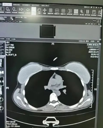 比如,被举报的患者中,72岁的“杨某某”、62岁的“邱某某”的病历中,有根据所拍片子的情况作出的诊断,却找不到对应的影像。6月份又查到了她们的CT影像,按照系统记录,她俩都是2023年4月做的胸部CT,片子上能清晰看出两位患者的吊坠形状、大小和位置都基本一致。不仅这两位上了年纪的患者,CT影像类似,朱成刚比对发现,2021年在他们科做过CT的25岁女性叶某的片子上,也有看起来极为相似的吊坠,肉眼看,她们三人的片子几乎一模一样。