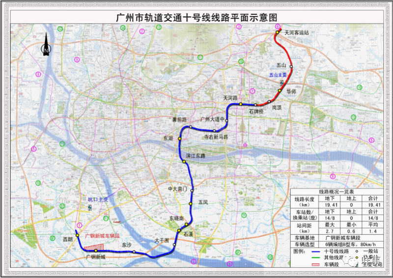 地铁十号线呈东北至西南走向,起于现有的天河客运站,终于现有的西朗站。十号线建成后将与三号线天河客运站至石牌桥段贯通运营,贯穿天河、越秀、荔湾、海珠等四个中心城区,是一条名副其实的中心城区轨道交通“加密线”。