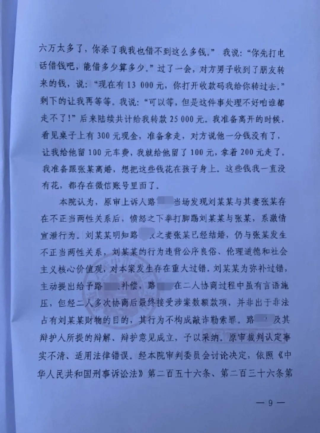 法院判决,路某某犯敲诈勒索罪,判处有期徒刑6个月,并处罚金5000元。路某某提出上诉,淄博市中级人民法院后维持原判,判决认为偷情不道德但无需赔偿。路某某此后向淄博中院申请再审被驳回,他又向山东省高院申请再审。