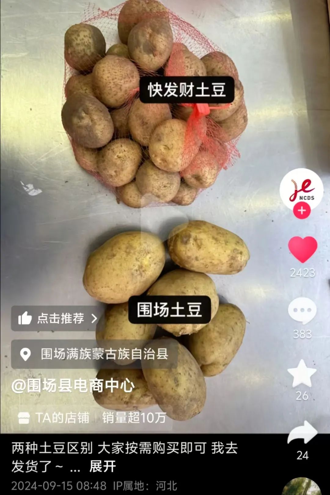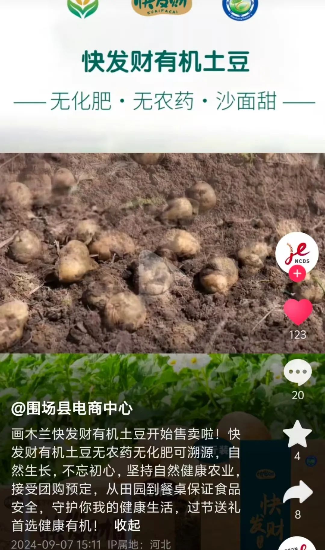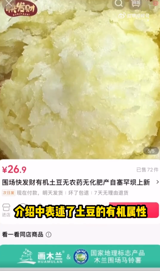 10月22日上午,记者搜索合作供应商鑫达商贸的产品链接,注意到其商品介绍中没有出现“有机”字样,但是在该公司账号此前发布的视频作品中,曾多次介绍其“快发财”土豆为“有机土豆”,“无化肥、无农药、沙面甜”。此外,还有视频作品呈现了“快发财土豆”和“围场土豆”的区别。