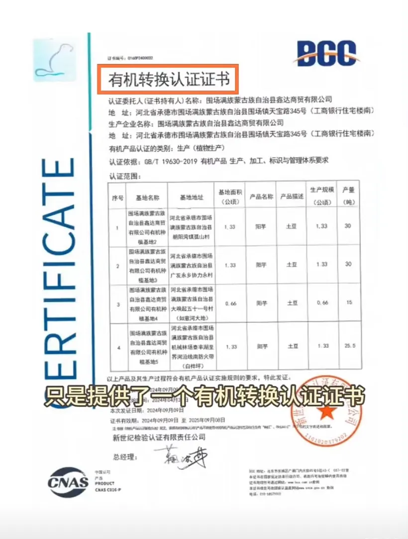 王海晒出的一份“有机产品认证证书”显示,供应商鑫达商贸公司有32吨左右的土豆被认证为有机产品,此次发证日期为2023年10月23日。 另有一份发证日期为2024年9月9日的网传“有机转换认证证书”显示,该公司四批产品共100吨许,均为有机转换产品,而非有机产品。