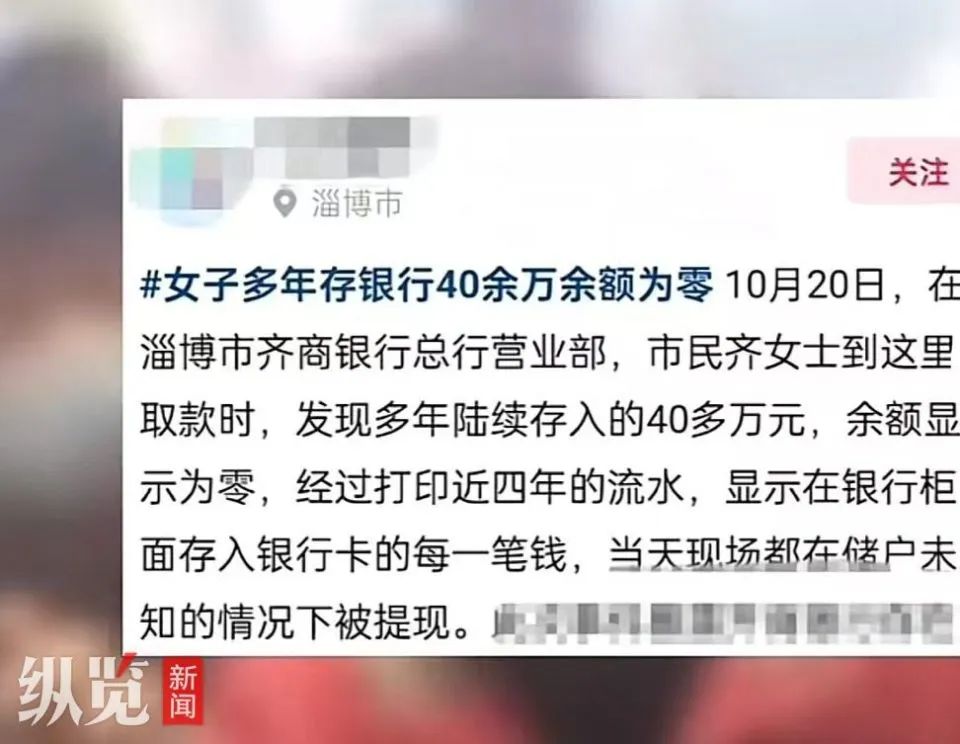 据新闻报道,山东淄博一女子称多年来在淄博齐商银行存款40多万元,取款时余额却为零。10月22日下午,记者以储户身份致电齐商银行淄博支行了解此事,工作人员表示,是该储户将银行卡账户和密码等信息泄露给了他人导致存款被取,具体信息还要向总行工作人员进一步了解。 据新闻此前报道,近日,有网友发文称,山东淄博一女子多年来在淄博齐商银行存款40多万元,取款时余额却为零。据帖文发布者称,当事储户齐女士打印近四年银行流水发现,她在银行柜台存入银行卡的每一笔钱,当天都在储户未知的情况下被提现。22日上午,记者私信帖文发布者,但截至发稿未收到回复。 10月22日,齐商银行客服回应称,此事已向相关业务部门反馈,目前没有相应处理结果。国家金融监督管理总局淄博监管分局工作人员表示,此事该局已关注跟进。  发帖人发帖配文(来源/网友发布视频截图)10月22日下午,记者以储户身份致电齐商银行淄博支行了解此事,一名接电话的工作人员表示,据她了解,是该储户将银行卡账户和密码信息泄露给了别人。“我也只是听到了这个消息,具体信息还要向总行进一步了解。”该工作人员补充道。 随后,记者拨打齐商银行官网公布的总机电话了解此事,工作人员表示,当时有公安人员到场,也向该储户建议可以到属地派出所进行报案。对于是否为储户将账号密码等信息泄露给他人导致存款被取,该工作人员表示,暂时还在等相关的业务通知。 记者多次拨打国家金融监督管理总局淄博监管分局电话了解此事,但截至发稿前均无人接听。 据齐商银行官网介绍,齐商银行股份有限公司成立于1997年8月28日,是全国第四批城市信用社组建的股份制商业银行。截至2023年12月末,齐商银行资产总额达到 2367.56亿元,各项存款余额1825.67亿元,各项贷款余额1373.59亿元,在淄博地区存贷款市场份额持续保持全市银行业金融机构首位。 文章来源于红星新闻、纵览新闻、极目新闻,如有侵权请联系删除