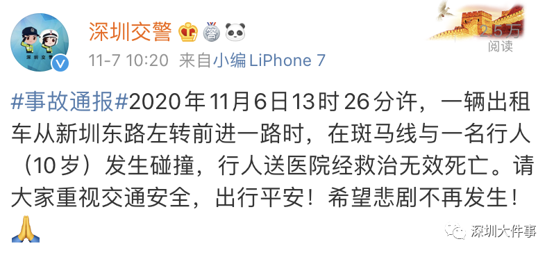 而今天(11月7日)上午,深圳交警发布通报称,2020年11月6日13时26分许,一辆出租车从新圳东路左转前进一路时,在斑马线与一名行人(10岁)发生碰撞,行人送医院经救治无效死亡。