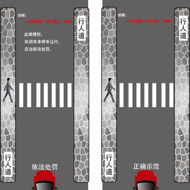 行人步入斑马线,第③车道车辆必须让行,行人开始通过斑马线,所在车道车辆和下一车道车辆必须让行,行人到达中央绿化隔离带或双黄线,下一车道车辆必须让行。