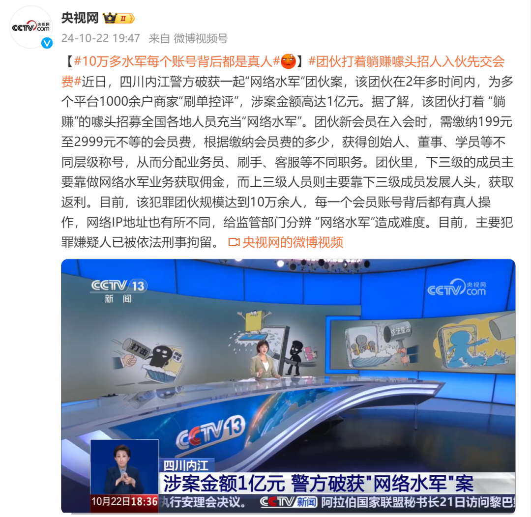 目前,该犯罪团伙规模达到10万余人,每一个会员账号背后都有真人操作,网络IP地址也有所不同,给监管部门分辨 “网络水军”造成难度。