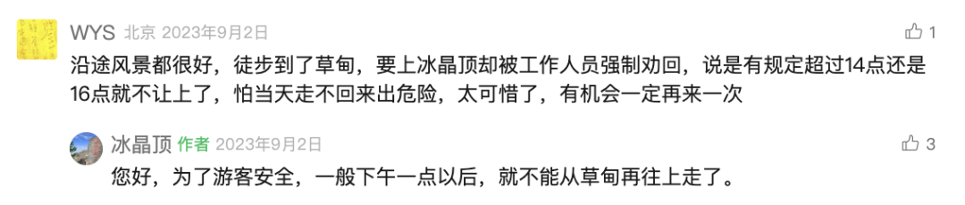 了解到,冰晶顶的官方账号还曾2023年9月回复游客:为了游客安全,一般下午1点以后,就不能从草甸再往上走了。