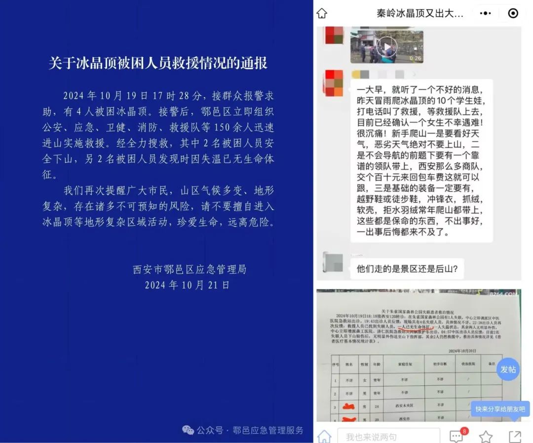 10月20日,多位西安网友发帖称,秦岭冰晶顶发生户外事故,2个年仅20出头的情侣因在山顶失温不幸遇难。