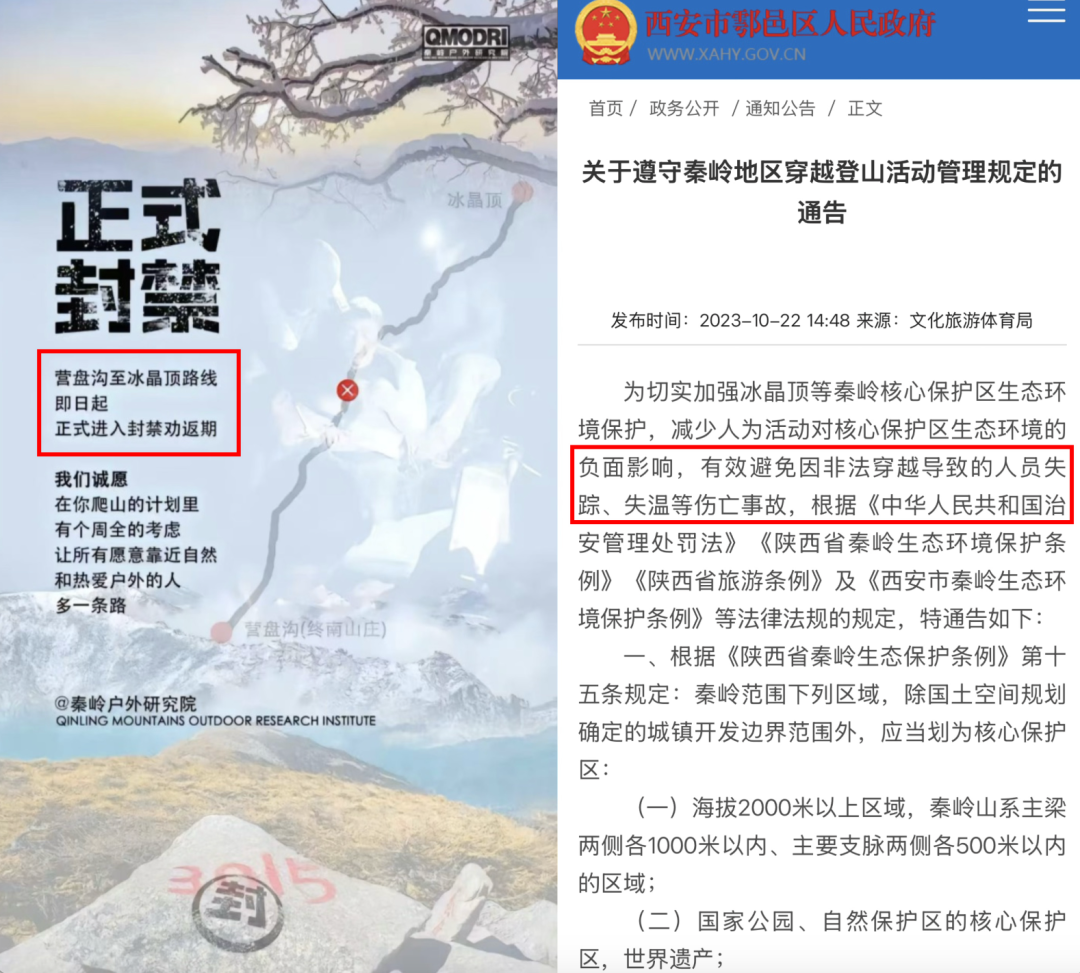 值得一提的是,目前冰晶顶已经正式进入封禁劝返期。2023年10月,西安市鄠邑区曾发布官方通告,希望能有效避免因非法穿越导致人员失踪、失温等伤亡事故。