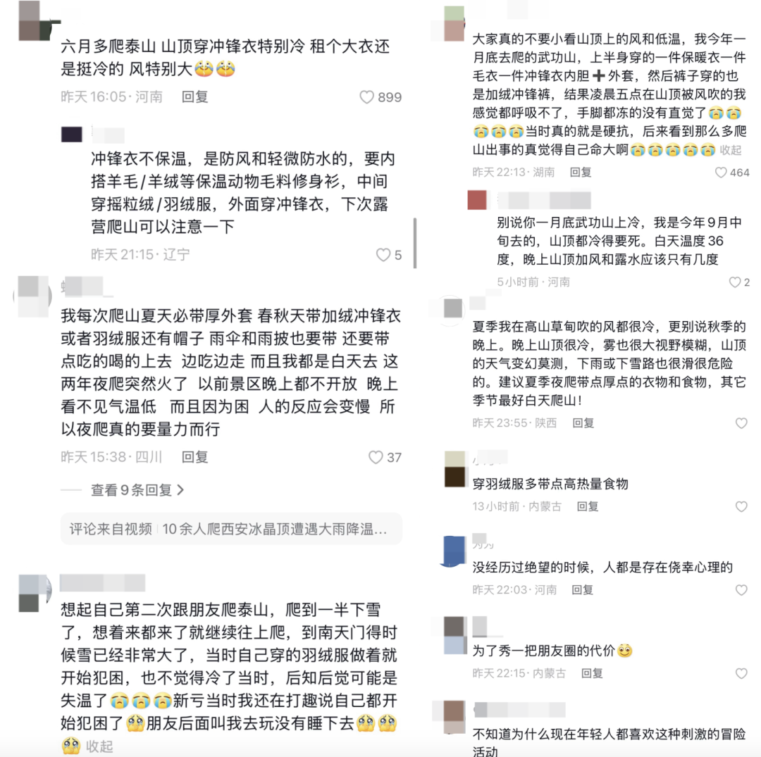 面对这些夜爬失温遇难的案例,很多爬过山的网友科普,即使是夏天山上也是非常冷的,带的衣服少很容易引发失温发生意外,劝解大家“夏天夜爬带厚衣服和食物,其他季节最好白天爬山”。