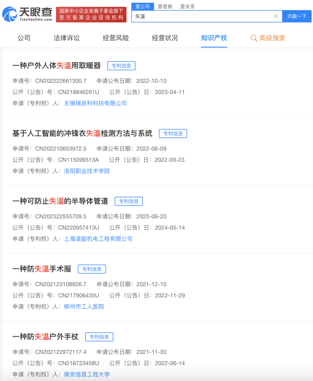 看到,天眼查上有不少人申请了关于“失温”的专利,比如“防失温户外手杖”、“户外防止失温的多功能药盒”、“户外智能防失温功能裤”……