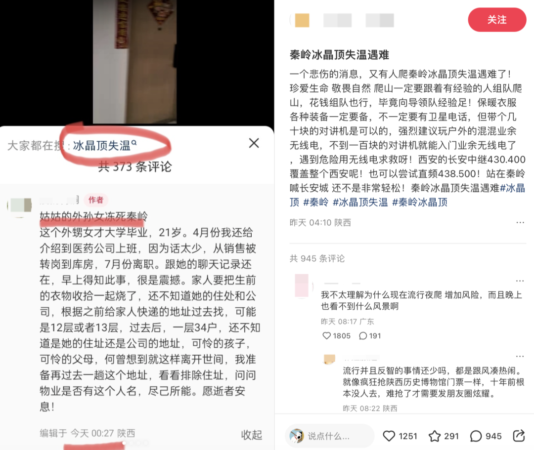 就在这对情侣失温遇难前,今年5月,一位来自江西的男生也因夜爬秦岭冰晶顶,导致失温去世。