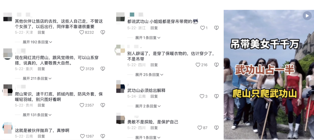 之后有网友讨论遇难女生是“穿吊带爬山”、“被同伴抛弃”等……才导致失温遇难。在社交平台搜索“武功山吊带”发现,平台上很多视频提到,去武功山爬山都是去看穿吊带的小姐姐,甚至“武功山吊带”还成为了网络热梗。