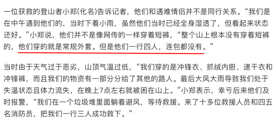 但有获救的登山者告诉记者,遇难情侣一行四人上山“穿的是常规外套,连包都没有”。