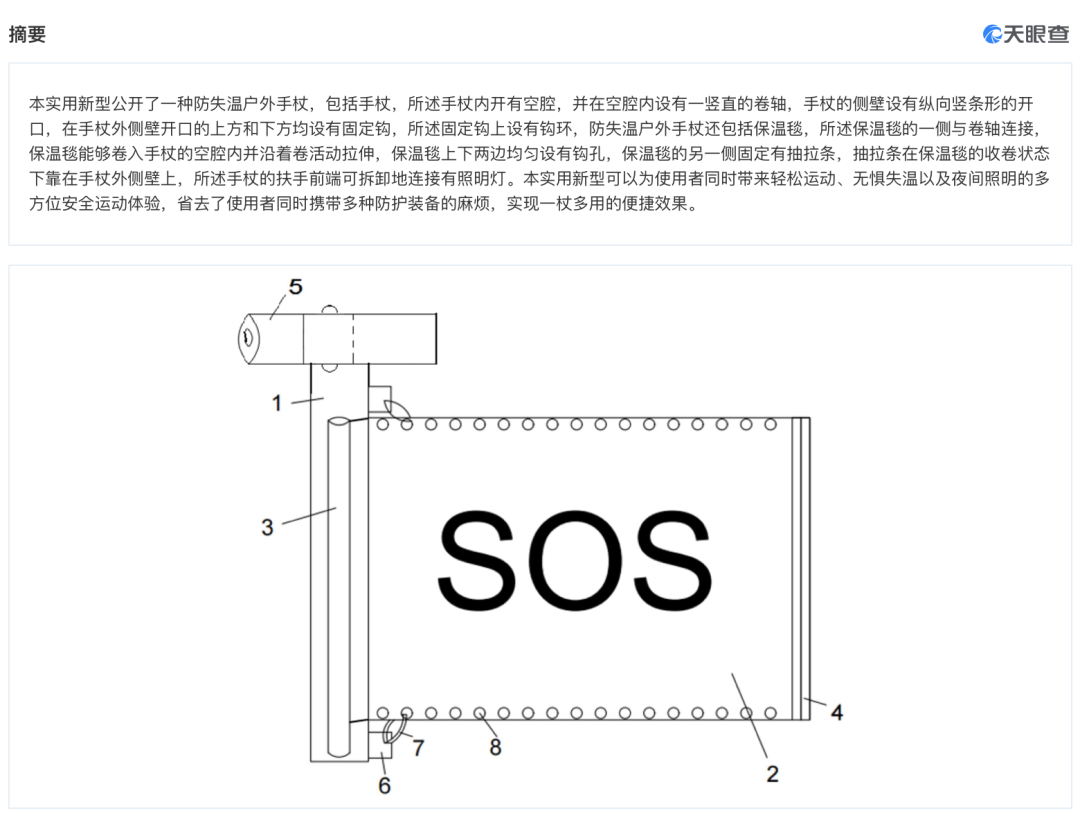 比如,防失温户外手杖专利是通过一个手杖中,隐藏进保温毯、照明灯、定钩等物品,实现一杖多用。为使用者带来轻松运动、无惧失温以及夜间照明的多方位安全运动体验。