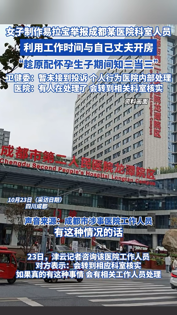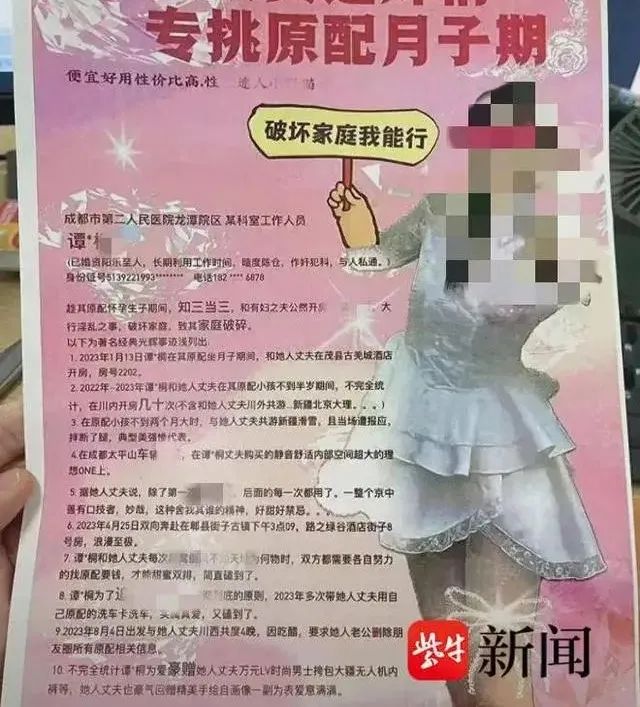 近日,一名女子制作了一张海报,举报成都市第二人民医院龙潭院区一名女性工作人员谭某某,“趁原配怀孕生子期间知三当三”,长期利用工作时间和举报人的丈夫外出开房,并一口气列出10条相关情节,引发热议。