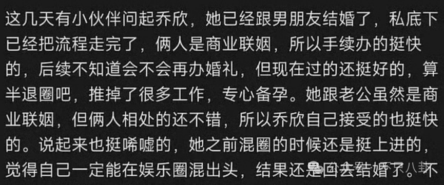 网传小道消息为以下版本,有博主称乔欣已经办了结婚登记手续,她和男方是商业联姻,已知乔欣是富二代,但男方的财富实力更强劲,两人是家里安排的相亲。尽管说是联姻,但俩人感情基础也是有的,彼此相处得不错,目前乔欣半退圈状态,正在备孕中。