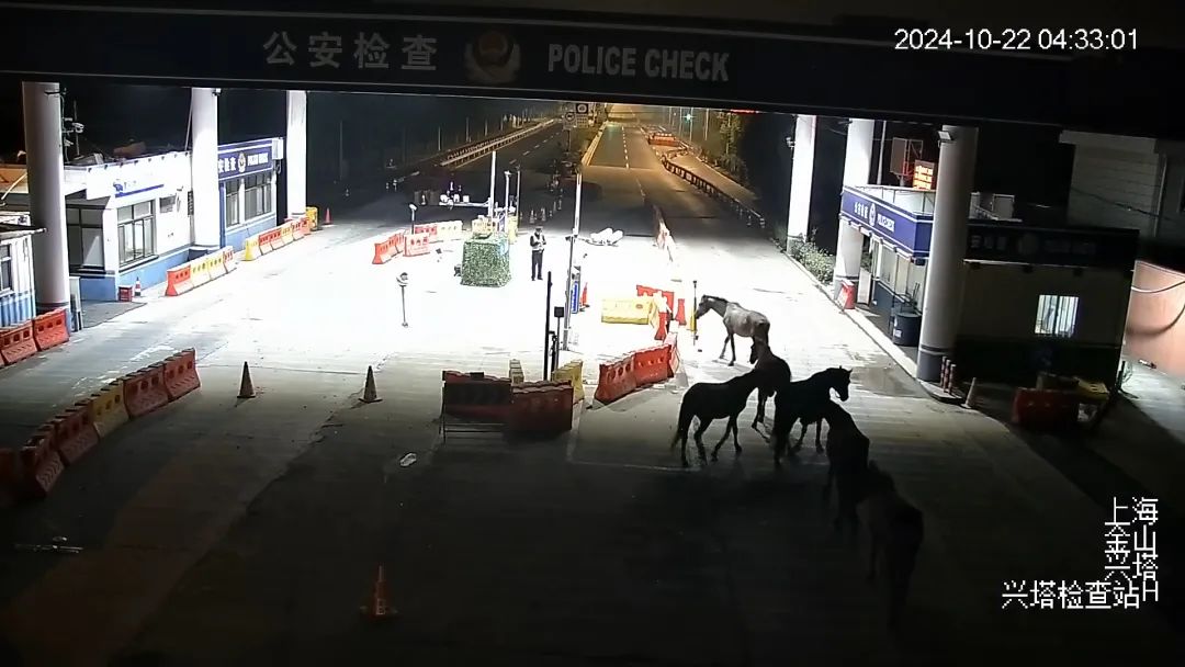 10月22日凌晨5点,金山公安分局兴塔检查站执勤民警发现,有七匹马从浙江方向进入兴塔检查站,随后在兴塔社区内行走,身边并无马主人作陪。