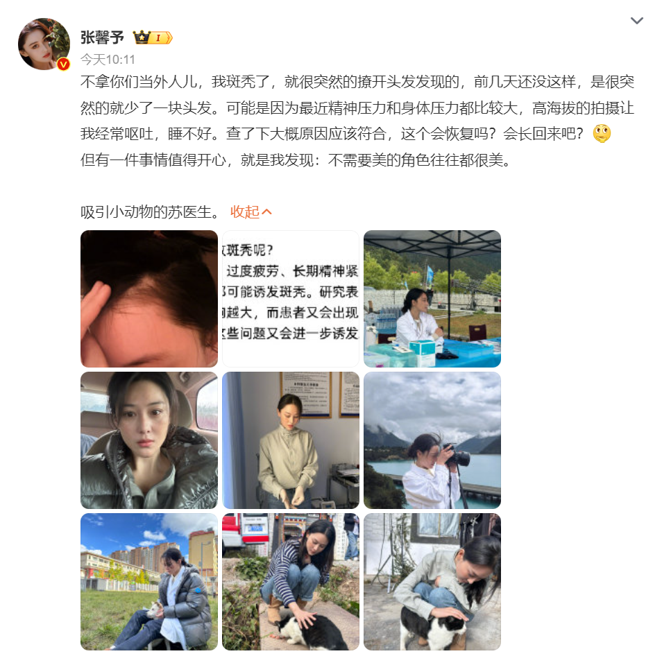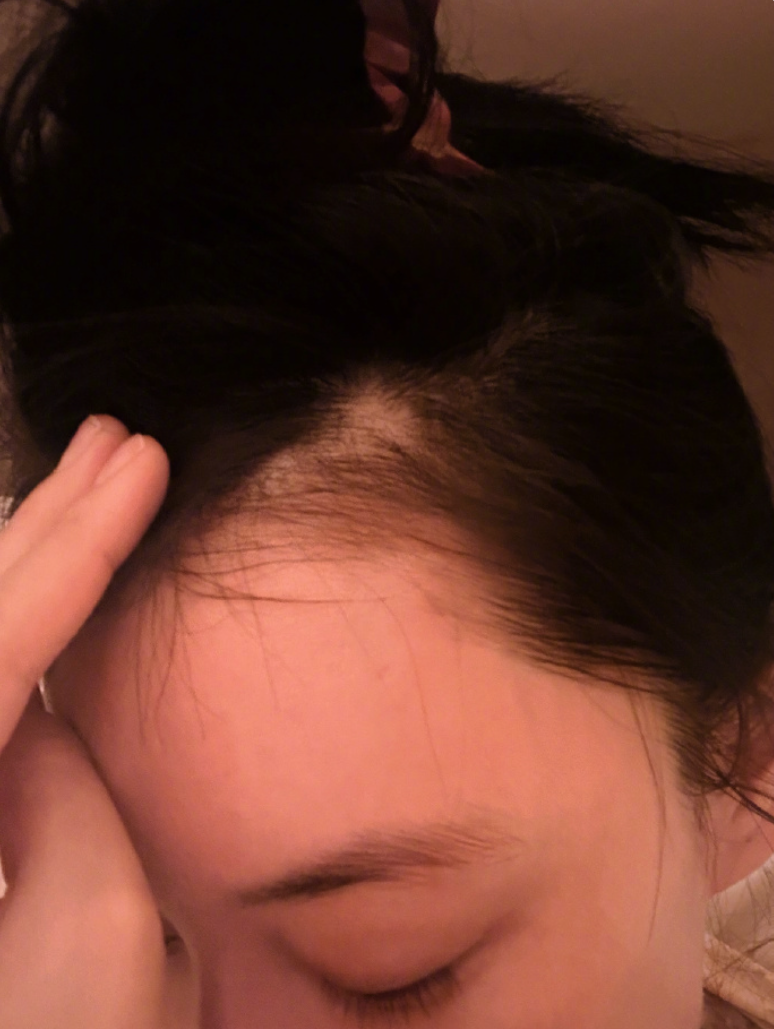 “不拿你们当外人儿,我斑秃了,就很突然地撩开头发发现的,前几天还没这样,是很突然的就少了一块头发。”
