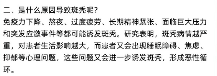 除了精神和身体压力这两个因素外,遗传和免疫系统疾病也有相关性。如果自身合并白癜风、银屑病、甲状腺疾病、内分泌失调等,也有可能会让斑秃找上门。
