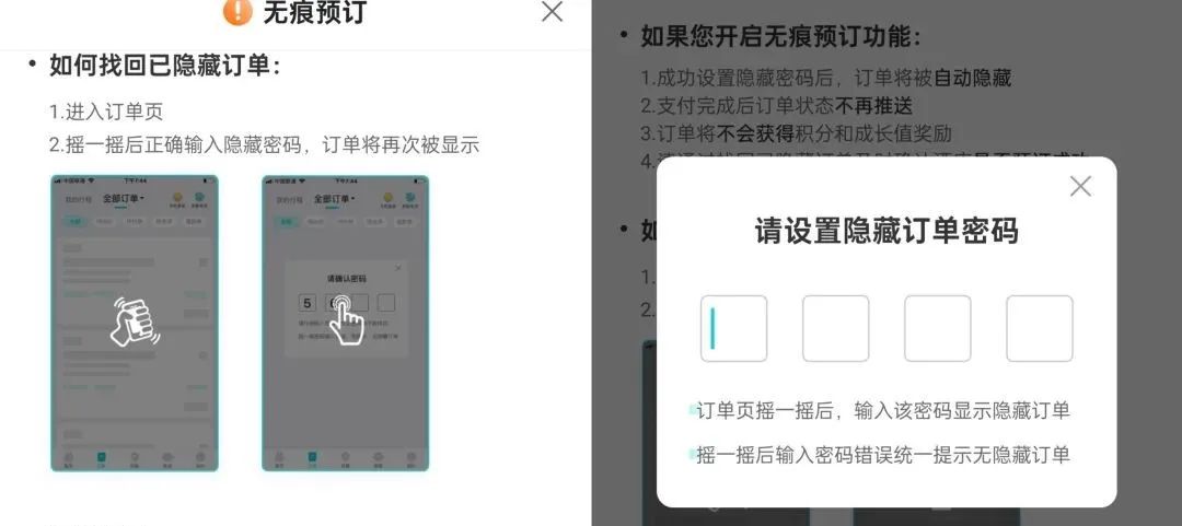 例如某旅游预订网站和APP的“无痕预订”功能。该平台App显示,用户选择该功能后,订单将被自动隐藏,支付成功后订单状态也不再推送。