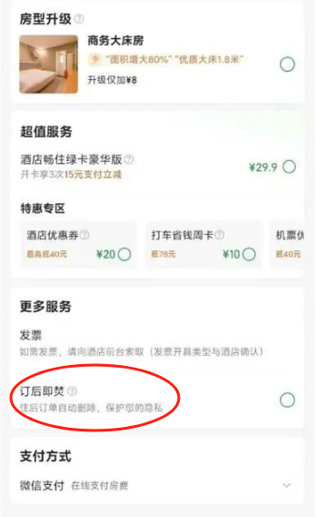 该旅行平台小程序显示,“订后即焚”属于自选服务,用户选择后,订单将会在用户成功入住酒店后次日12点自动删除,届时用户将无法查看订单的预订记录;支付完成后,入住前订单的最新状态只能在订单详情页查看,不再发送微信和短信通知;含保险的订单需在入住次日12点前申请理赔;企业会员返现订单删除后,将无法在订单详情页领取返现。