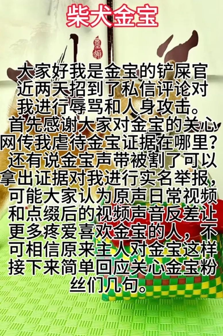 10月27日,有网友发文称,发现拥有百万粉丝的宠物博主“柴犬金宝”深夜在社交平台发布一段视频,该视频疑似为未剪辑原视频。 视频显示,该博主不断对狗大声喊叫,强硬地指挥它执行各种动作。 还有网友在仔细观察“柴犬金宝”发布的多条视频后,发现宠物“金宝”在视频中从未发出过叫声。这引发了对其声带是否受损的猜测,一些网友质疑博主存在虐狗行为。 面对网友质疑,该博主发文回应:“近两天收到了私信评论,对我进行辱骂和人身攻击。首先感谢大家对‘金宝’的关心。网传我虐待‘金宝’证据在哪里?还有说‘金宝’声带被割了,可以拿出证据,对我进行实名举报。” 不过,该博主也承认了对视频进行了点缀。“可能大家认为原声日常视频和点缀后的视频声音反差,让更多疼爱喜欢金宝的人,不相信原来主人对金宝这样,接下来简单回应几句。”